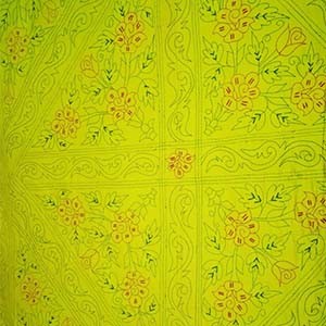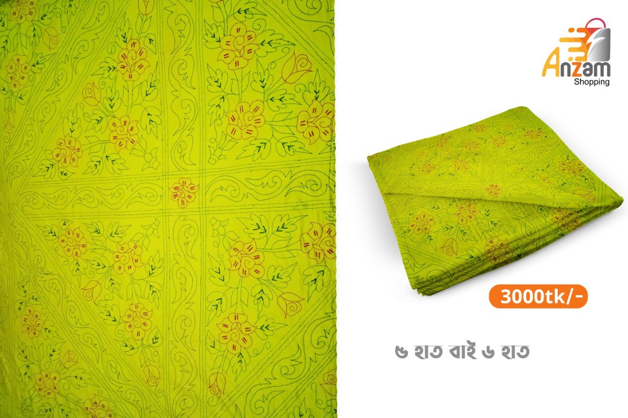 Nakshi Katha, a type of embroidered quilt, is a centuries-old Bengali art tradition in Bangladesh. The basic material used is thread and old cloth. The colorful patterns and designs that are embroidered resulted in the name "Nakshi Kantha", which was derived from the Bengali word "naksha", which refers to artistic patterns. The early kathas had a white background accented with red, blue, and black embroidery; later yellow, green, pink, and other colours were also included. The running stitch called "Katha stitch" is the main stitch used for the purpose. Traditionally, Katha was produced for the use of the family. Today, after the revival of the nakshi kantha, they are produced commercially.